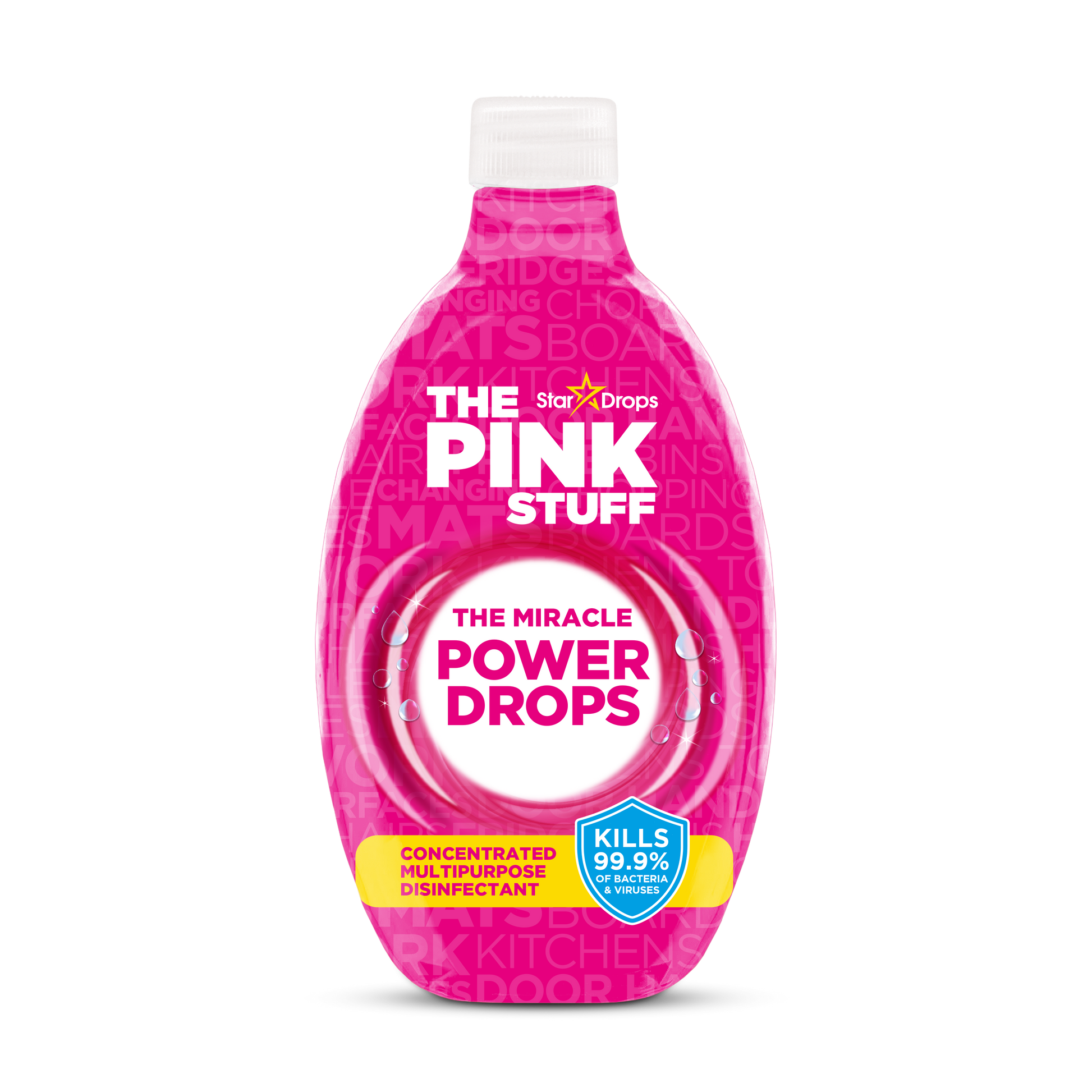 The Pink Stuff Power Drops desinfectante concentrado. Diluya y rocíe, deje actuar, limpie, friegue o use en desagües y sumideros limpios. Ideal para limpiar y desinfectar superficies lavables y selladas.